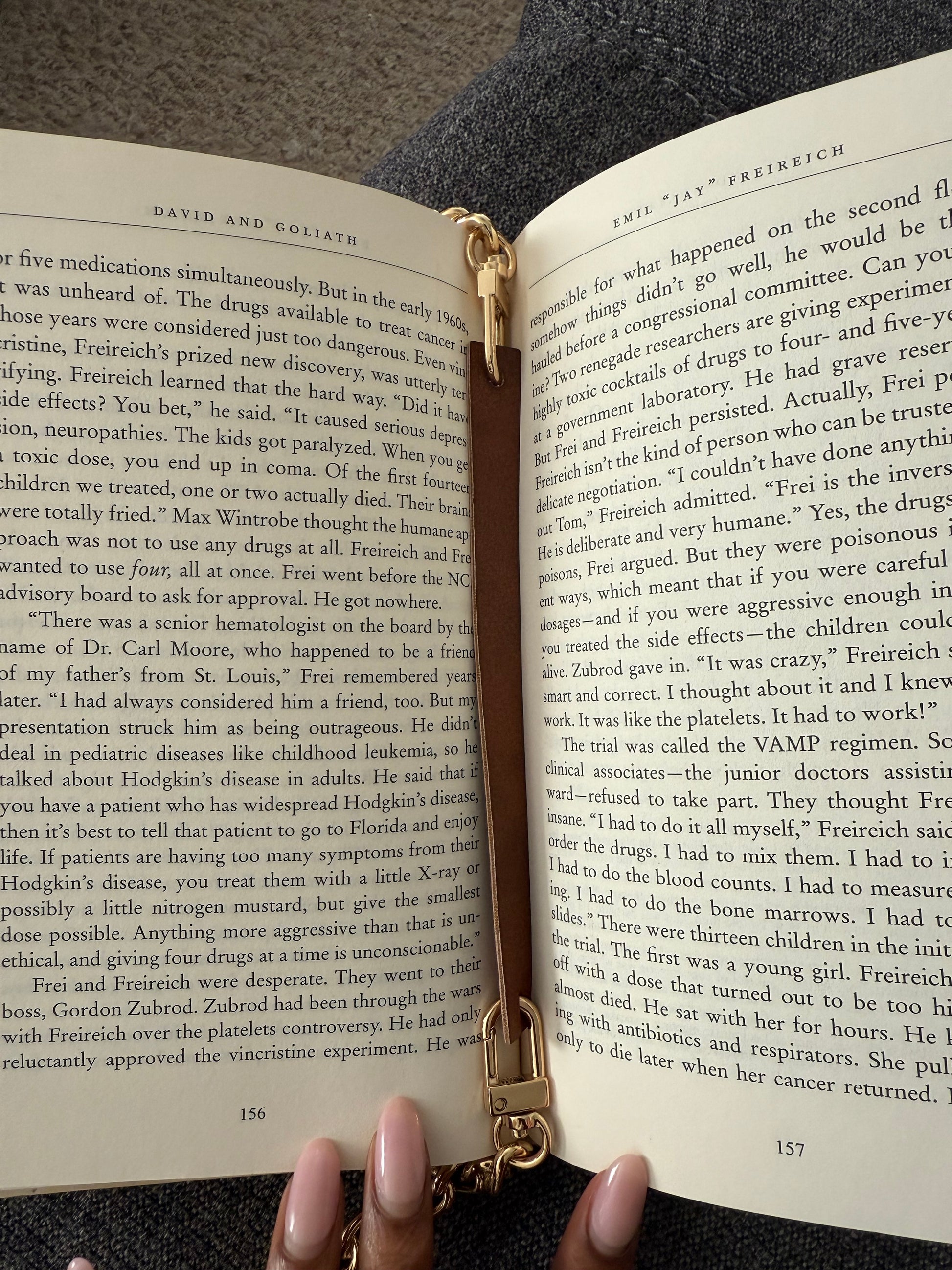 Where books and fashion collide! Step-up your book fashion game with this super cute gold chain bookmark. It turns your book into a fashion accessory in seconds while keeping track of what page you're on. The gold chain is lightweight, durable, and attached to a high-quality leather bookmark. This bookmark is meant to be worn as a crossbody. Other colors and styles available soon!
